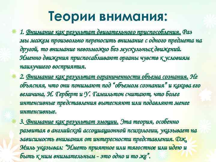 Теории внимания: 1. Внимание как результат двигательного приспособления. Раз мы можем произвольно переносить внимание с одного предмета на другой, то внимание невозможно без мускульных движений. Именно движения приспосабливают органы чувств к условиям наилучшего восприятия. 2. Внимание как результат ограниченности объема сознания. Не объясняя, что они понимают под “объемом сознания” и какова его величина, И. Герберт и У. Гамильтон считают, что более интенсивные представления вытесняют или подавляют менее интенсивные. 3. Внимание как результат эмоции. Эта теория, особенно развитая в английской ассоциационной психологии, указывает на зависимость внимания от интересности представления. Дж. Миль указывал: “Иметь приятное или тягостное или идею и быть к ним внимательным - это одно и то же”.