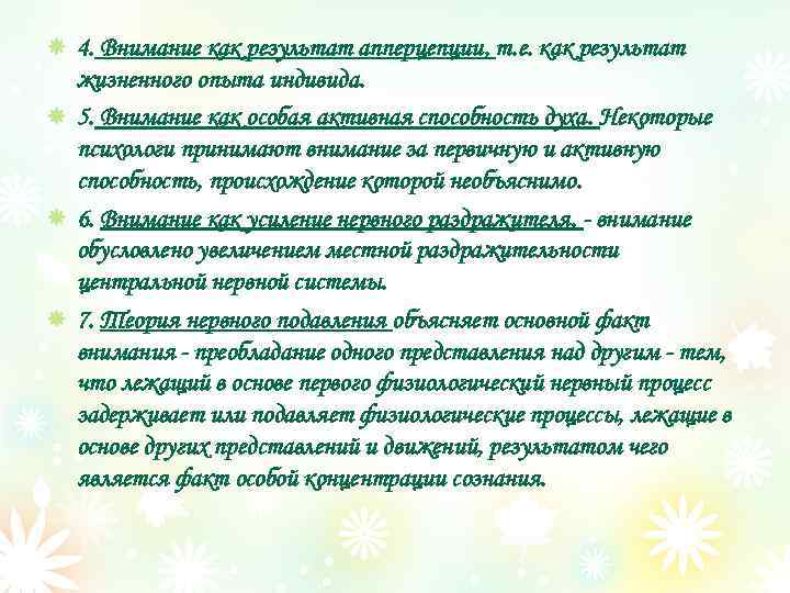 4. Внимание как результат апперцепции, т. е. как результат жизненного опыта индивида. 5. Внимание как особая активная способность духа. Некоторые психологи принимают внимание за первичную и активную способность, происхождение которой необъяснимо. 6. Внимание как усиление нервного раздражителя. - внимание обусловлено увеличением местной раздражительности центральной нервной системы. 7. Теория нервного подавления объясняет основной факт внимания - преобладание одного представления над другим - тем, что лежащий в основе первого физиологический нервный процесс задерживает или подавляет физиологические процессы, лежащие в основе других представлений и движений, результатом чего является факт особой концентрации сознания.