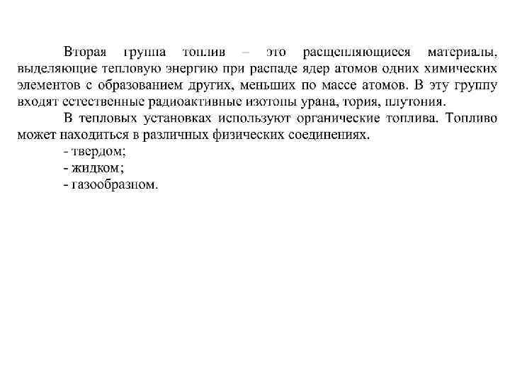 По назначению органическое топливо подразделяется на: - технологическое; - энергетическое. Технологическое - это те виды топлива, которые являются не только источником тепловой энергии, но и используются как компонент технологического процесса. Энергетическое - те виды топлива, которые являются главным образом источником тепловой энергии. Состав топлива Свойства топлива как горючего материала определяются его составом. Чтобы установить состав топлива, производят его технический и химический анализ. При техническом анализе определяют содержание влаги, летучих веществ, золы. Химический (элементный) анализ можно выполнить как по элементному составу, так и определением содержания в топливе определенных химических соединений. Первый метод (по элементному составу) применяют для твердого и жидкого топлива, второй - для газообразного.