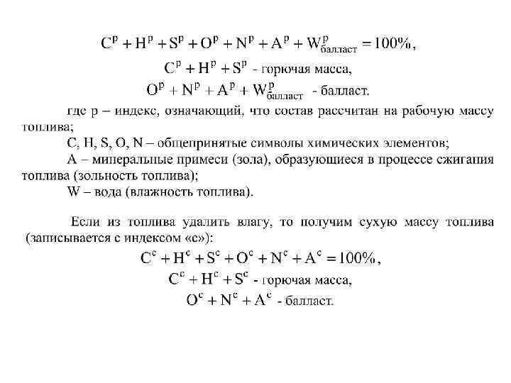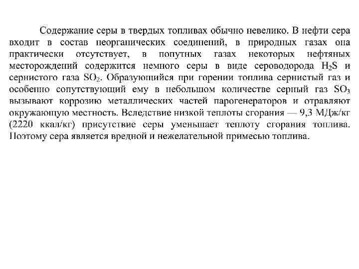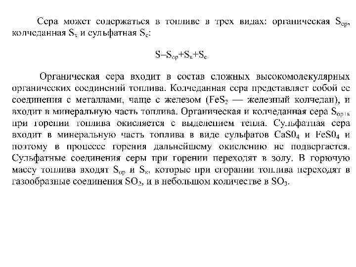 Элементный состав топлива Элементы топлива Индекс С H O N S летучая S орг. А W S колч. о г с р Сера в топливе может находиться в виде различных соединений: органических соединений So, колчедана Sк и сернистых солей в виде сульфатов Ca. SO 4, Fe. SO 4 и др. Органическая и колчеданная сера могут гореть и их объединяют в летучую серу Sк + So = Sл. Сульфаты не горят и являются балластом топлива.