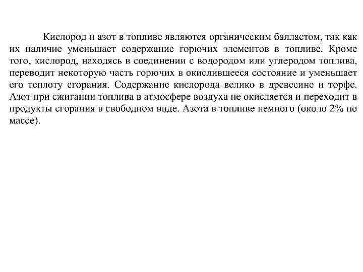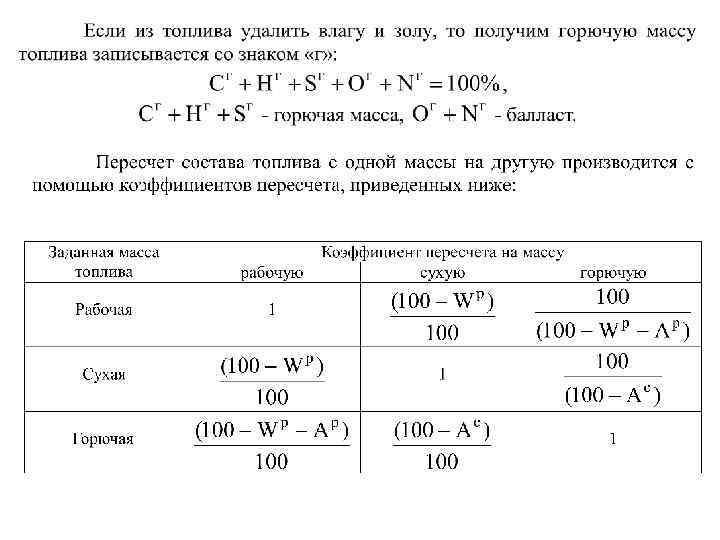 Под теоретически необходимым понимают то минимальное количество воздуха, которое требуется для полного окисления всех горючих элементов топлива. Его определяют из стахиометрических реакций окисления горючих элементов топлива. [ l 0 ] = [ кг воздуха/ кг топлива ], [ V 0 ] = [ м 3 воздуха / кг топлива]. Если обозначить G 0 массовое количество О 2, необходимое для окисления всех горючих элементов 1 кг топлива, то l 0 можно определить из выражения: l 0 = G 0 / 0, 232 , где 0, 232 - массовая доля О 2 в воздухе. V 0 = l 0 / 1, 293 , где 1, 293 кг/м 3 - плотность воздуха при нормальных условиях. CP + HP + SPЛ + OP + NP + AP + WP = 100 G 0 = G 0 C + G 0 H + G 0 S - G 00 ,