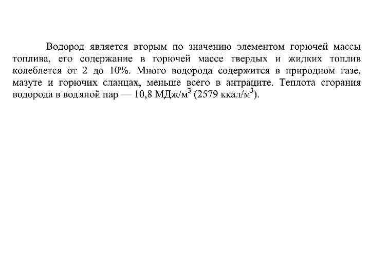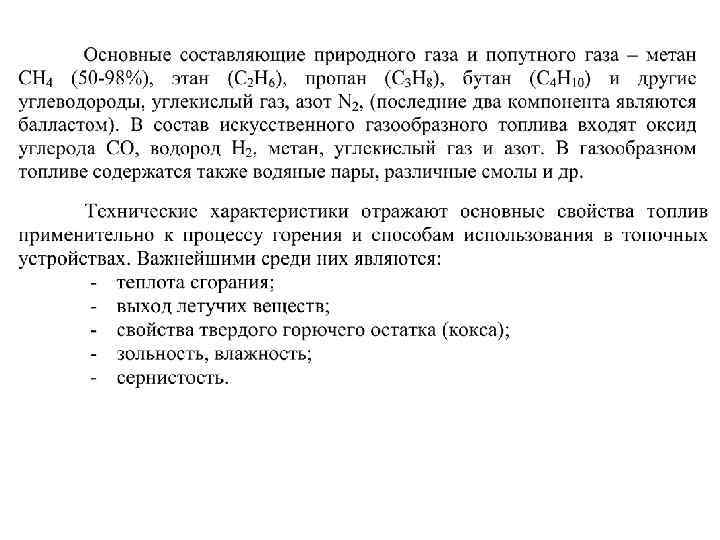 Влага Относится к внешнему балласту, снижает содержание горючих элементов, снижает тепловую ценность топлива. На 1 кг влаги расходуется 2, 51 МДж/кг. Состав газообразного топлива Газообразное топливо представляет собой простую механическую смесь горючих и негорючих газов. Горючими элементами газообразного топлива являются: СH 4, Cm. Hn, H 2 S, CO. Негорючие элементы: O 2, N 2, CO 2, H 2 O. CH 4 + H 2 + Cm. Hn +H 2 S + CO 2 + N 2 = 100 % (по объему)