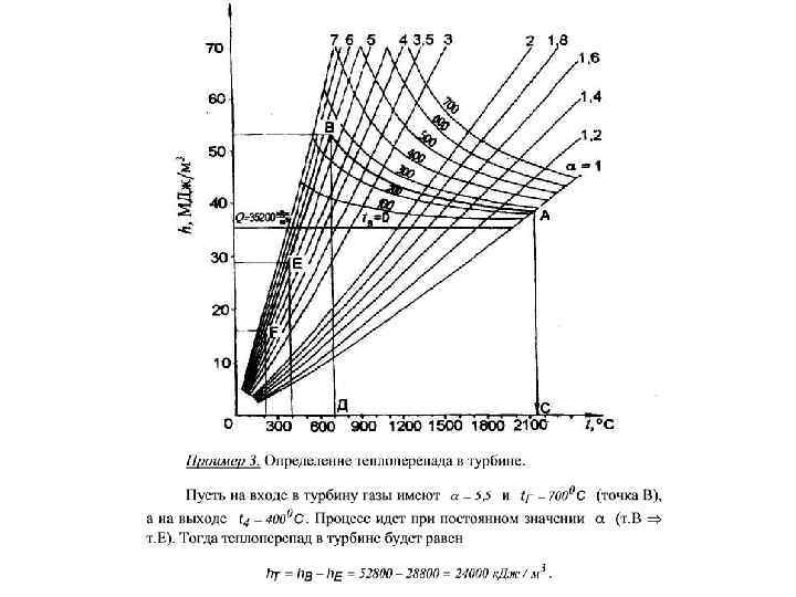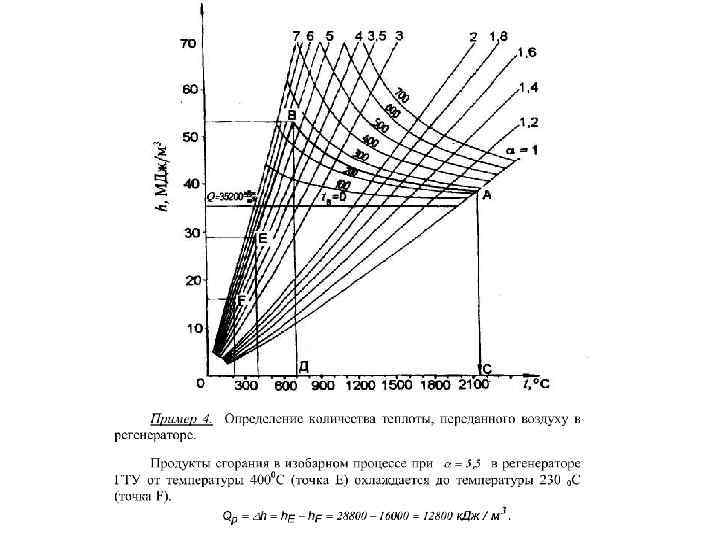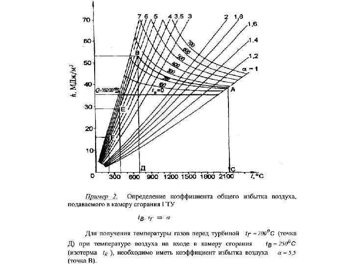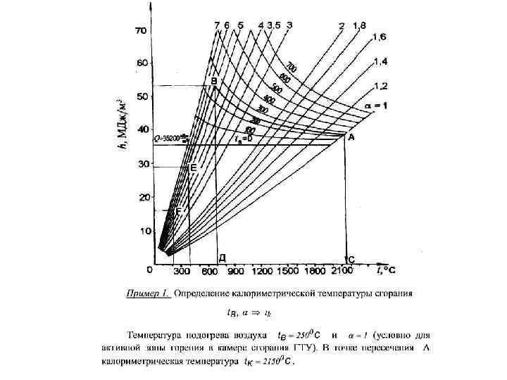 По оси координат отложены значения энтальпии продуктов сгорания, отнесенные к единице количества топлива (к. Дж/м 3), а по оси абсцисс температура газов. На диаграмме нанесены семейства кривых h=f(tг) для различны значений коэффициента избытка воздуха при полном сгорании топлива. Кроме того, даны кривые калориметрических температур сгорания при различных коэффициентах избытка воздуха и температурах подогрева воздуха.