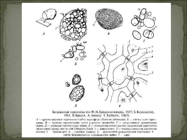 Особенности строения клеток запасающей паренхимы зависят от локализации накапливаемых ими веществ: Вакуоли Гиалоплазма Пол иса (кра харид ы х ину мал, лин ) ды ари ) х иса роза Д ха (са Моносахариды (глюкоза, фруктоза) Пластиды Оболочки