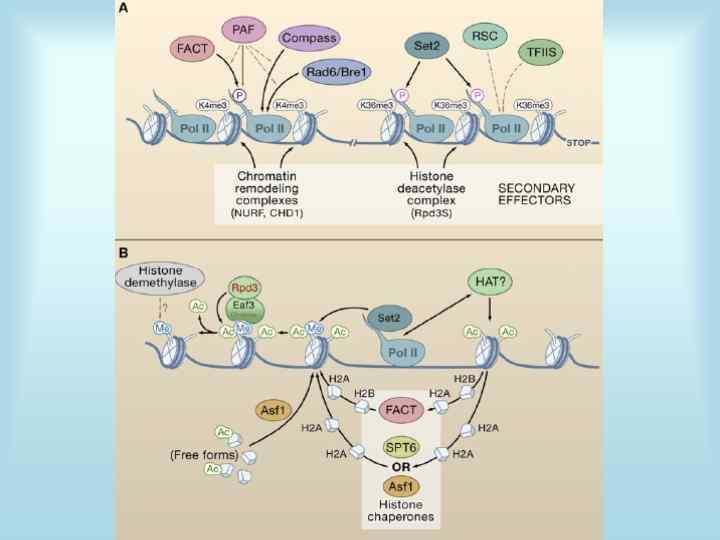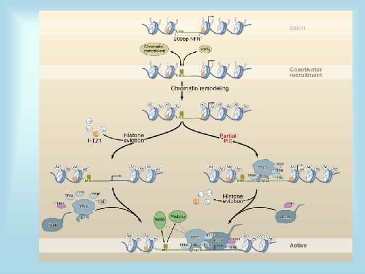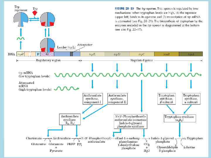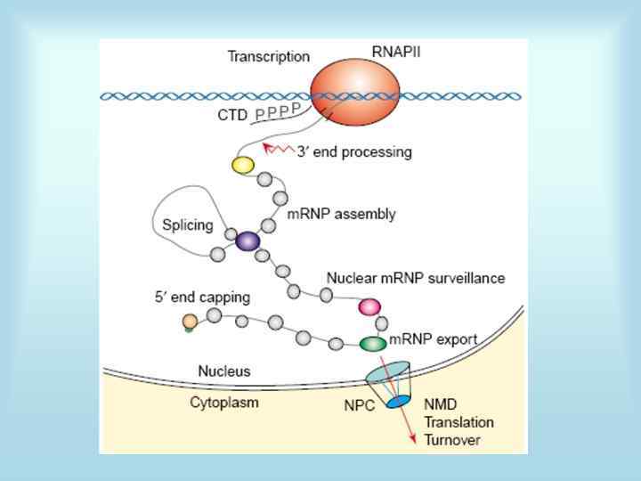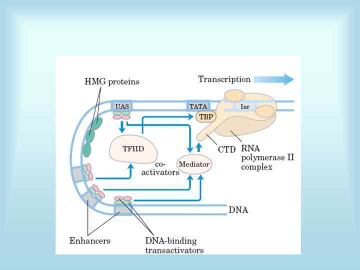 Основные точки регуляции экспрессии • 1. Синтез РНК (транскрипция) • 2. Посттранскрипционные модификации м. РНК • 3. Деградация м. РНК • 4. Синтез белка (трансляция) • 5. Посттрансляционные модификации белков • 6. Транспорт белков • 7. Деградация белков