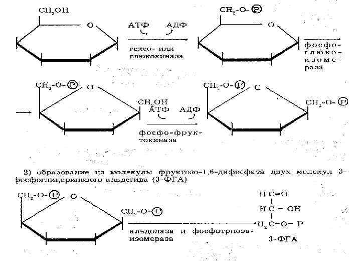 • Далее под влиянием фермента альдолазы происходит расщепление Ф 1, 6 ДФ с образованием двух триоз: • 3 Ф глицеральдегида (3 ФГА) и диоксиацетон Ф (ДОФ). • В дальнейшем в реакциях гликолиза уже участвуют не 6 ти углеродные, а трехуглеродные соединения.