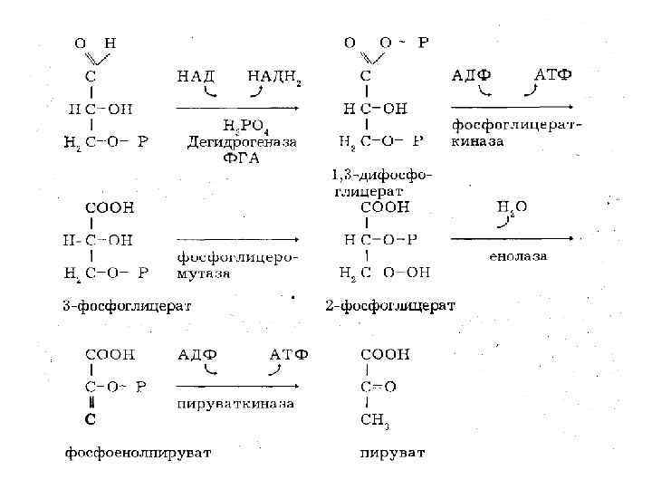 Таким образом, в ходе превращения глюкозы в ПВК происходит образование 4 молекул АТФ: 2 молекулы АТФ освобождаются при окислении двух молекул 1, 3 дифосфоглицерата в 3 фосфоглицерат, и еще 2 молекулы АТФ образуются при превращении фосфоенолпирувата в ПВК.