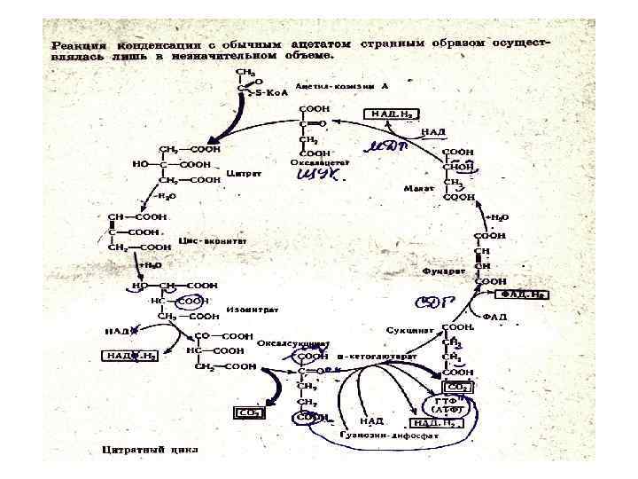 • Еще один высокоэнер гетический фосфат производится на субстратном уровне при превращении сукцинил~Ко. А в сукцинат. Таким образом, всего за период каждого цикла образуется 12 молекул АТФ.