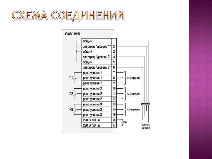 Функциональная схема САУ-М 6 Контроль уровня осуществляется при помощи 4 -х электродного кондуктометрического датчика, три сигнальных электрода которого расположены в резервуаре на заданных по условиям технологического процесса отметках: уровень 1, уровень 2, уровень 3 — и подключаются ко входам прибора 1– 3. Питание датчика уровня осуществляется переменным напряжением. Прибор САУ-М 6 включает в себя три независимых канала контроля, в состав каждого канала входят: регулятор чувствительности, позволяющий изменять чувствительность канала контроля уровня к электропроводности жидкости; входное устройство (вход), измеряющее сопротивление кондуктометрического датчика на переменном токе; пороговое устройство (ПУ), служащее для фиксации достижения рабочей жидкостью заданных уровней, а также для формирования сигналов, предназначенных для управления выходными реле; выходное реле, предназначенное для управления внешним оборудованием; срабатывание реле происходит при контакте соответствующего электрода с жидкостью.