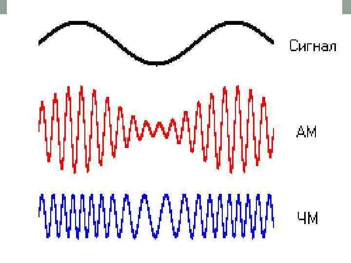 ЧАСТОТНАЯ МОДУЛЯЦИЯ • Частотная модуляция (ЧМ) — вид аналоговой модуляции, при котором информационный сигнал управляет частотой несущего колебания. По сравнению с амплитудной модуляцией здесь амплитуда остаётся постоянной.