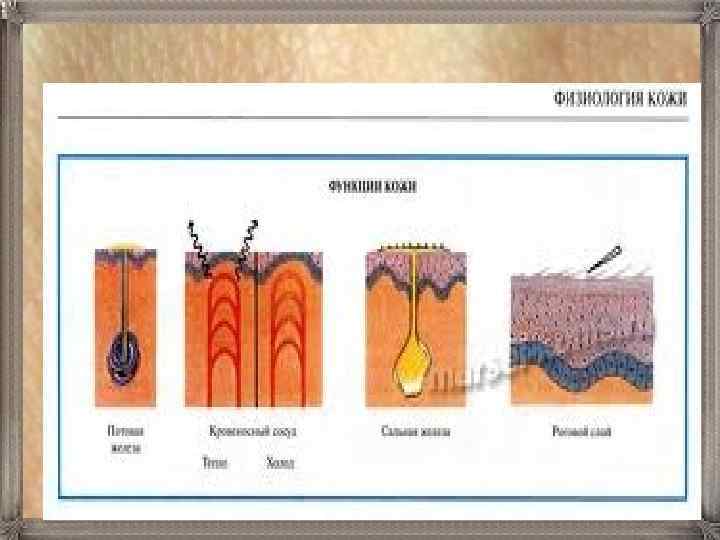 q Кожа выполняет одну из основных функций в терморегуляции – поддерживает температуру тела около 37 o Когда холодно, кровеносные капилляры сужаются, чтобы кровь, циркулирующая по поверхности кожи не переохлаждалась. q Если температура окружающей среды высокая, капилляры расширяются, чтобы большее количество крови поступало к поверхности кожи, отдавая тепло, и выделяется пот, который при высыхании охлаждает поверхность кожи.