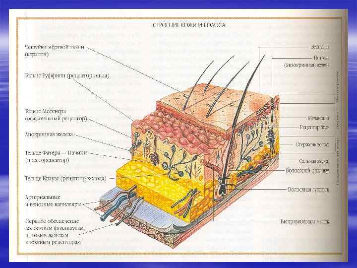 Рецепторы кожи q В среднем на 1 см квадратный кожи приходится до 5000 чувствительных окончаний, 200 болевых, 12 холодовых, 2 тепловых, 25 рецепторов, реагирующих на давление. q Нервные рецепторы в коже распределены неравномерно. Особенно их много в коже лица, ладоней и пальцев кисти. q Нервы вегетативной нервной системы обеспечивают иннервацию придатков кожи, кровеносных и лимфатических сосудов, регулирую физиологические процессы в коже 1—свободные нервные окончания; 2 — нервные окончания у корня волос; 3, 4 — «осязательные тельца» ; 5, 6 — нервные окончания, воспринимающие тепло и холод