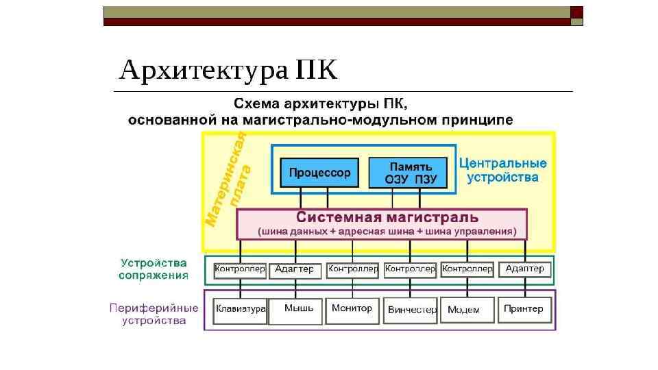 Основные структурные элементы микропроцессора ПК • Устройство управления (УУ) - формирует и подает во все блоки машины в нужные моменты времени определенные сигналы управления (управляющие импульсы), обусловленные спецификой выполняемой операции и результатами предыдущих операций; формирует адреса ячеек памяти, используемых выполняемой операцией, и передает эти адреса в соответствующие блоки ЭВМ; опорную последовательность импульсов устройство управления получает от генератора тактовых импульсов. • Арифметико - логическое устройство (АЛУ) - предназначено для выполнения всех арифметических и логических операций над числовой и символьной информацией (в некоторых моделях ПК для ускорения выполнения операций к АЛУ подключается дополнительный математический сопроцессор); • Микропроцессорная память (МПП) - служит для кратковременного характера, записи и выдачи информации, непосредственно используемой в вычислениях в ближайшие такты работы машины. Регистры - быстродействующие ячейки памяти различной длины ; • Интерфейсная система микропроцессора - реализует сопряжение и связь с другими устройствами ПК; включает в себя внутренний интерфейс МП, буферные запоминающие регистры и схемы управления портами ввода-вывода (ПВВ) и системной шиной. Интерфейс (interface)- совокупность средств сопряжения и связи устройств компьютера, обеспечивающая их эффективное взаимодействие. Порт ввода-вывода (I/O - Input/Output port) - аппаратура сопряжения, позволяющая подключить к микропроцессору другое устройство ПК.