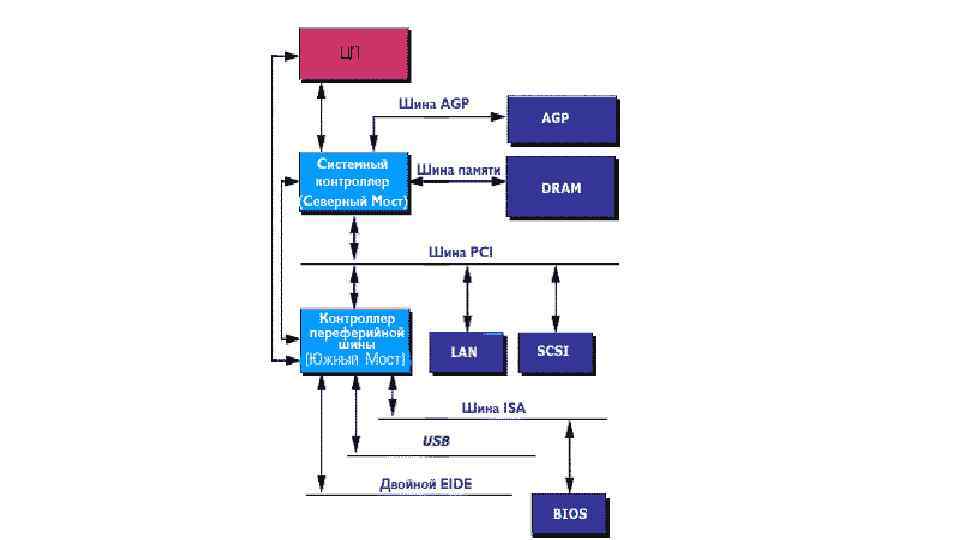 Архитектура чипсета В целях обеспечения лучшей работы микропроцессора, его стабильности и надежности очень большую роль играет компоновка и дизайн материнских плат. На представленном рисунке схематически изображено устройство архитектуры любой материнской платы. Чипсет материнской платы состоит из двух компонентов (которые, как правило, представляют собой независимые чипсеты, связанные друг с другом). Называются эти компоненты Северный и Южный мост. Они означают расположение чипсета моста относительно шины PCI: Северный находится выше, а Южный - ниже. Эти названия дали чипсетам по выполняемыми ими функциями: они служат для связи различных шин и интерфейсов.