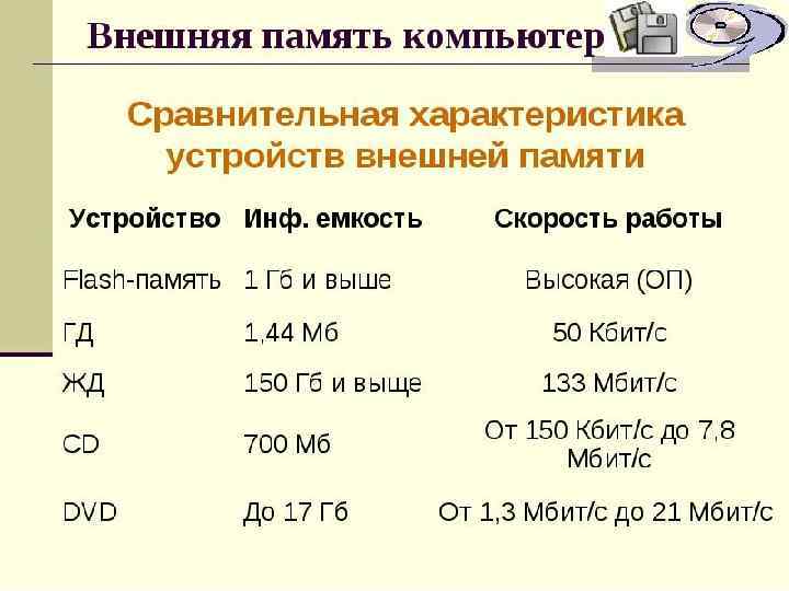 Характеристики устройств внешней памяти Чем больше объем жесткого диска, тем лучше. На современных ПК устанавливают жесткие диски, объем которых измеряется в гигабайтах: десятки и сотни гигабайтов. Покупая компьютер, вы приобретаете и необходимый набор программ на жестком диске. Обычно покупатель сам заказывает состав программного обеспечения компьютера. Практически обязательной составляющей комплекта ПК стали дисководы для CD-ROM. Современное программное обеспечение распространяется именно на этих носителях. Вместимость CD-ROM исчисляется сотнями мегабайтов (стандартный объем — 700 Мб).