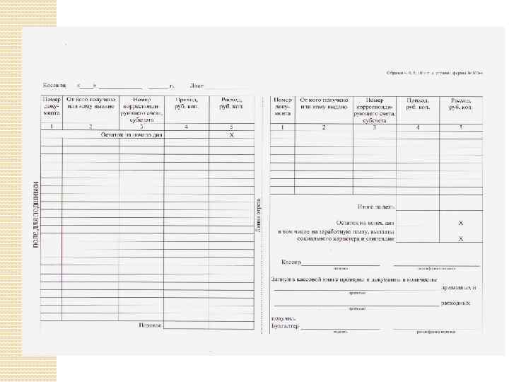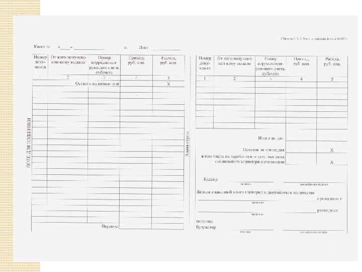 Расчет лимита кассы L=V / P x Nc • V - объем поступлений наличных денег за проданные товары, выполненные работы, оказанные услуги за расчетный период в рублях • Р - расчетный период, за который учитывается объем поступлений наличных денег (не более 92 дней) • Nc - период времени между днями сдачи (не более 7 дней, если в населенном пункте нет банка – то не более 14 дней) L=R / P x Nn • R - объем выдач наличных денег за расчетный период в рублях • Р - расчетный период, за который учитывается объем выдачи наличных денег (не более 92 дней) • Nn - период времени между днями получения денег по чеку (не более 7 дней, если в населенном пункте нет банка – то не более 14 дней)