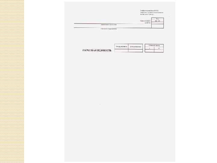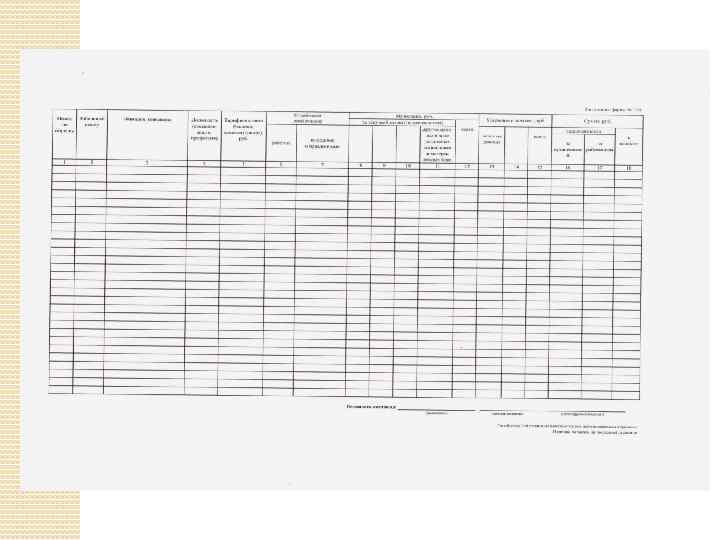 Заработная плата: начисление Заработная плата начисляется исходя из: 1. системы оплаты труда, применяемой на предприятии; 2. сведений об установленных тарифах, окладах, сдельных расценках; 3. сведений о фактически отработанном времени сотрудниками или об объеме произведенной продукции. Согласно трудовому законодательству начисление и выплата заработной платы производится не реже чем каждые полмесяца. Начисленные суммы фиксируются в Расчетной ведомости (унифицированная форма № Т-51) или в Расчетно-платежной ведомости(унифицированная форма № Т-49)