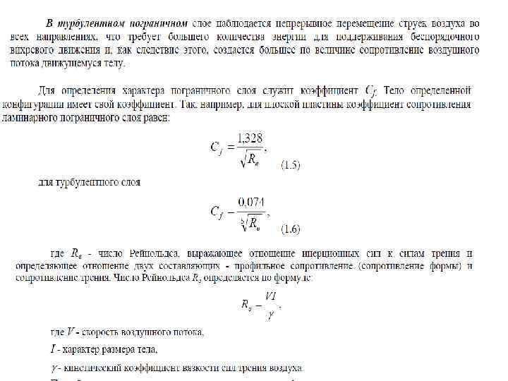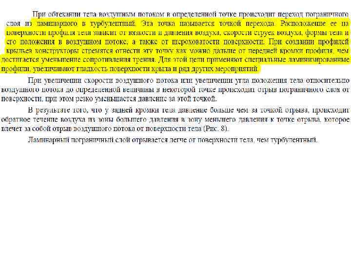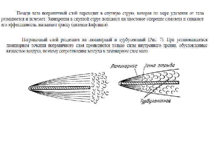 На верхней поверхности тела, в месте наибольшего поджатия струек, согласно закону неразрывности струй будет наблюдать местное увеличение скорости потока и, следовательно, уменьшение давления. На нижней поверхности деформация потока будет меньше и, следовательно, меньше изменение скорости и давления. Нетрудно заметить, что степень деформации струек в потоке будет зависеть от конфигурации тела и его положения в потоке. Зная спектр обтекания тела, можно для каждой его точки подсчитать величину давления воздуха и таким образом судить о величинах и характере действия аэродинамических сил. Так как на различные точки поверхности обтекаемого тела (профиля крыла) действуют разные по величине силы давления, результирующая их будет отлична от нуля. Это различие давлений в разных точках поверхности движущегося крыла является основным фактором, обусловливающим появление аэродинамических сил. Величины давлений на поверхность для различных тел определяют в лабораториях путем продувки в аэродинамических трубах. Полученные значения давлений для каждой точки наносят на специальные графики Кроме сил давления, на поверхность крыла по касательной к ней действуют силы трения, которые обусловлены вязкостью воздуха и целиком определяются процессами, происходящими в пограничном слое. Суммируя распределенные по поверхности крыла силы давления и трения, получим равнодействующую силу, которая называется полной аэродинамической силой. Точка приложения полной аэродинамической силы на хорде профиля крыла называется центром давления.