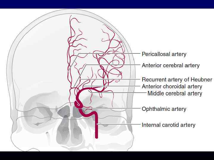 ПЕРЕДНЯЯ МОЗГОВАЯ АРТЕРИЯ (А 1 сегмент и ПСо. А) Прекоммуникантный сегмент, от бифуркации ВСА до ПСо. А, средняя длина ПСо. А 4 мм, диаметр 1. 7 мм. Ветви: А 1 - перфорирующие артерии (медиальная группа) ПСо. А - перфорирующие артерии (медиальная группа) Возвратная артерия Heubner