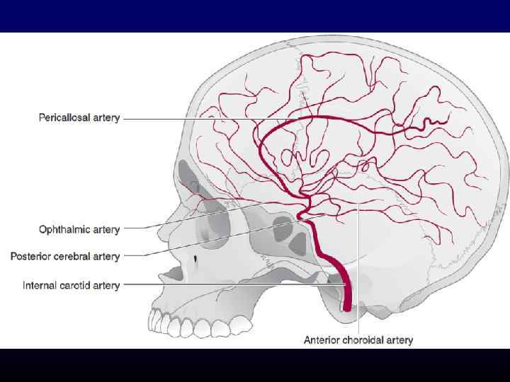 ПЕРЕДНЯЯ МОЗГОВАЯ АРТЕРИЯ 1. 2. 3. 4. 5. орбитофронтальная артерия фронтополярная артерия передняя внутренняя лобная артерия средняя внутренняя лобная артерия задняя внутренняя лобная артерия 6. парацентральная артерия 7. верхняя теменная артерия 8. нижняя теменная артерия 9. каллезомаргинальная артерия 10. перикаллезная артерия