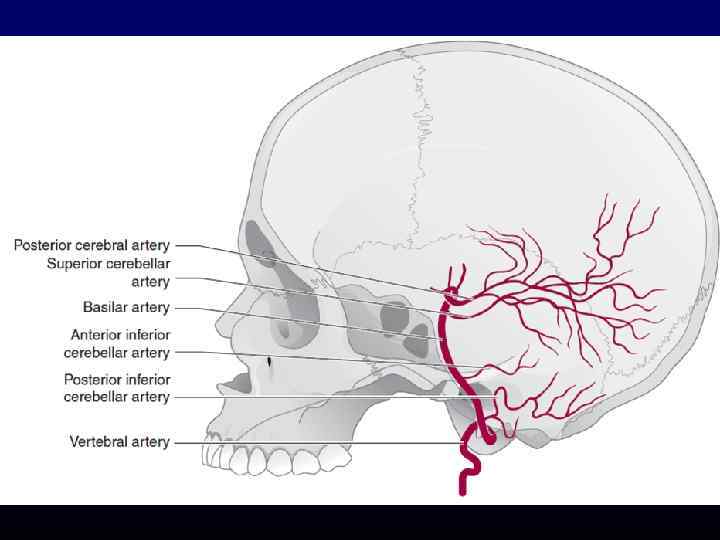 ОСНОВНАЯ АРТЕРИЯ Артерия образована двумя ПА и распространяется вверх до бифуркации на Заднии мозговые артерии. Длина в среднем 32 мм, диаметр 4. 1 мм. Имеет прямой ход в 45%, дугообразный в 35%, извитой в 20%. Ветви: 1. Передняя нижняя мозжечковая артерия – премеатальный сегмент – меатальный сегмент I. aud. c. – постмеатальный сегмент • • короткие перфоранты моста артерия лабиринта наддуговая артерия (пирамида) мозжечковые кортикальные ветви (анастомозируют с ЗНМА) (VI, VIII) 2. Базилярные перфоранты • медиальные • огибающие 3. Верхняя мозжечковая артерия (18. 5 мм) – передний мостосреднемозговой с. – боковой мостосреднемозговой с. – мозжечковосреднемозговой с. • ростральная порция (ствол) • каудальная (полушарие 9. 6 мм мозжечка) (III, IV, V-!)