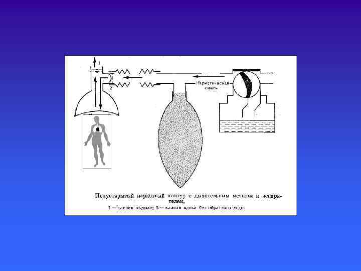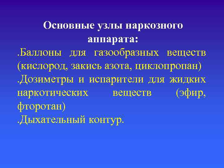 Основные узлы наркозного аппарата: . Баллоны для газообразных веществ (кислород, закись азота, циклопропан). Дозиметры и испарители для жидких наркотических веществ (эфир, фторотан). Дыхательный контур.