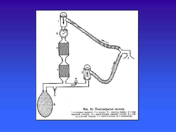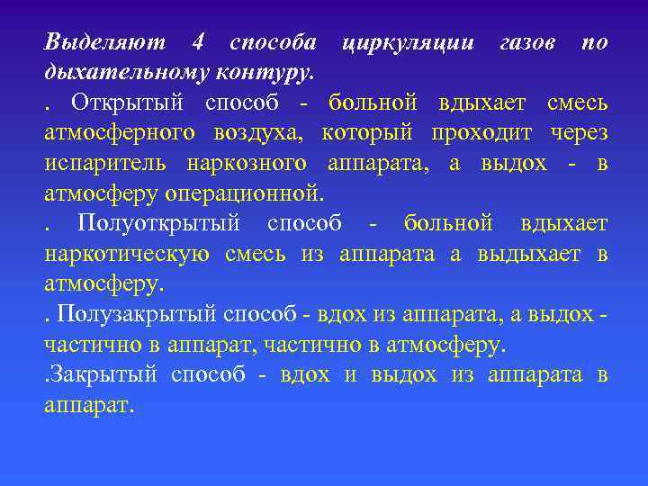 Выделяют 4 способа циркуляции газов по дыхательному контуру. . Открытый способ - больной вдыхает смесь атмосферного воздуха, который проходит через испаритель наркозного аппарата, а выдох - в атмосферу операционной. . Полуоткрытый способ - больной вдыхает наркотическую смесь из аппарата а выдыхает в атмосферу. . Полузакрытый способ - вдох из аппарата, а выдох частично в аппарат, частично в атмосферу. . Закрытый способ - вдох и выдох из аппарата в аппарат.