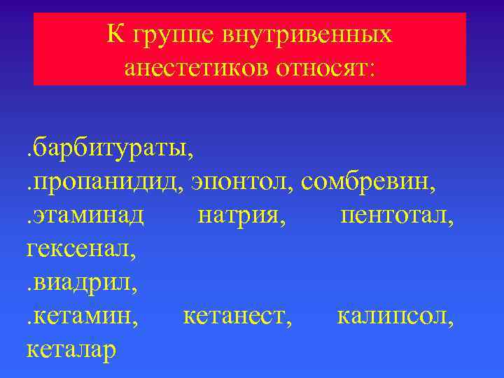 К группе внутривенных анестетиков относят: . барбитураты, . пропанидид, эпонтол, сомбревин, . этаминад натрия, пентотал, гексенал, . виадрил, . кетамин, кетанест, калипсол, кеталар