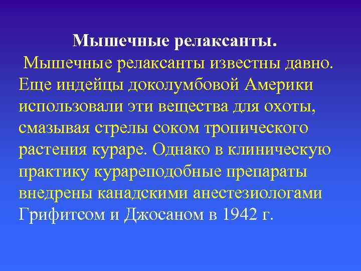 Мышечные релаксанты известны давно. Еще индейцы доколумбовой Америки использовали эти вещества для охоты, смазывая стрелы соком тропического растения кураре. Однако в клиническую практику курареподобные препараты внедрены канадскими анестезиологами Грифитсом и Джосаном в 1942 г.