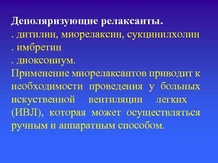 Деполяризующие релаксанты. . дитилин, миорелаксин, сукцинилхолин. имбретин. диоксониум. Применение миорелаксантов приводит к необходимости проведения у больных искуственной вентиляции легких (ИВЛ), которая может осуществляться ручным и аппаратным способом.