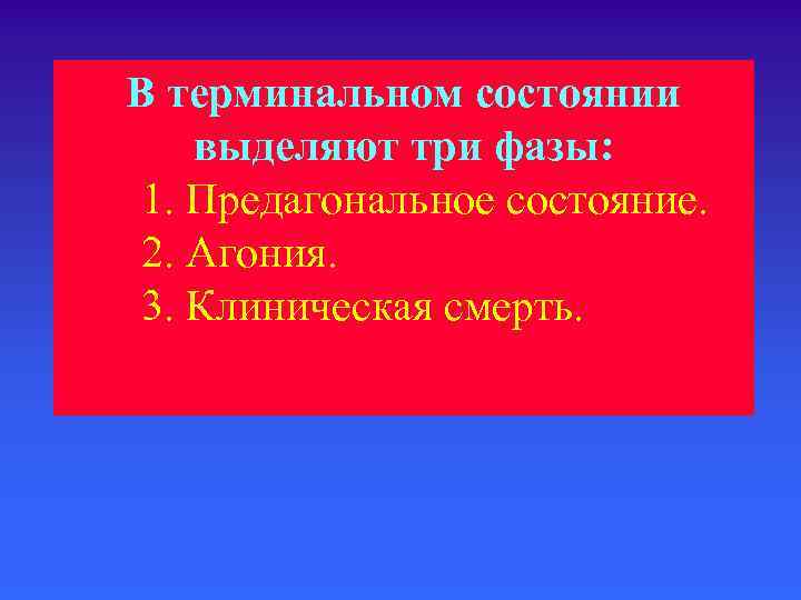 В терминальном состоянии выделяют три фазы: 1. Предагональное состояние. 2. Агония. 3. Клиническая смерть.