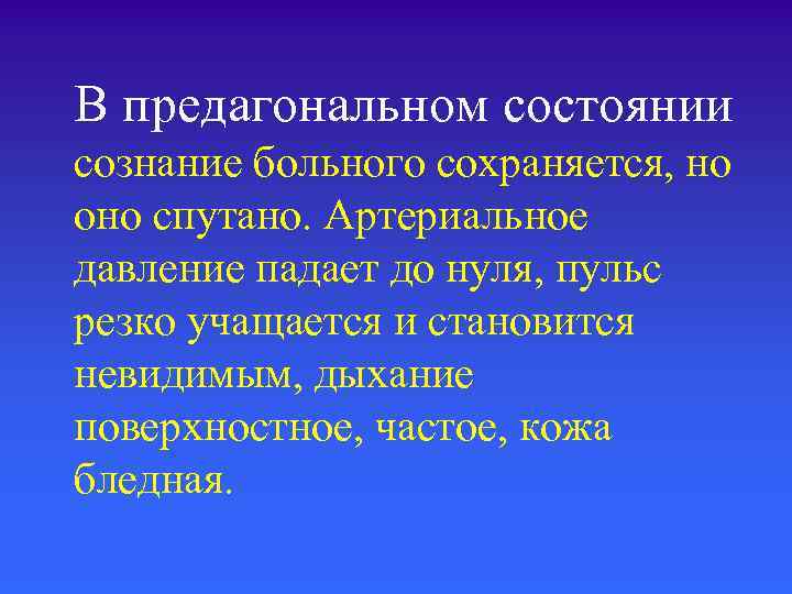 В предагональном состоянии сознание больного сохраняется, но оно спутано. Артериальное давление падает до нуля, пульс резко учащается и становится невидимым, дыхание поверхностное, частое, кожа бледная.