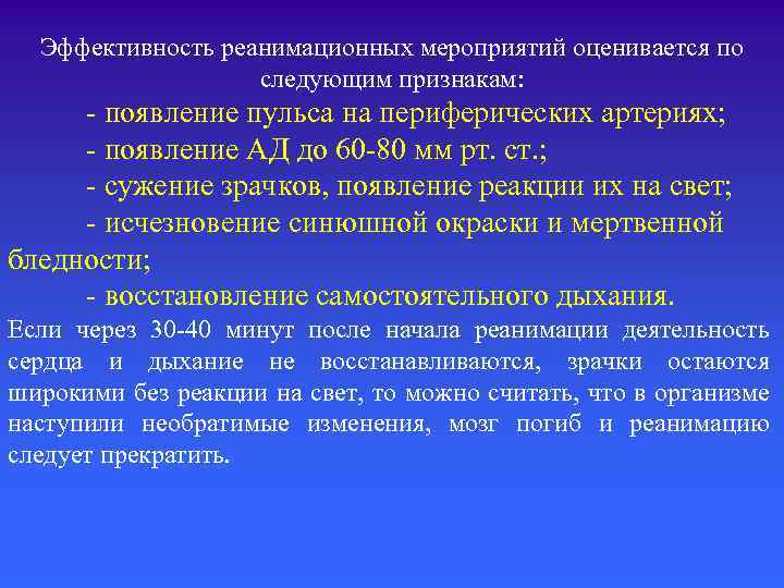 Эффективность реанимационных мероприятий оценивается по следующим признакам: - появление пульса на периферических артериях; - появление АД до 60 -80 мм рт. ст. ; - сужение зрачков, появление реакции их на свет; - исчезновение синюшной окраски и мертвенной бледности; - восстановление самостоятельного дыхания. Если через 30 -40 минут после начала реанимации деятельность сердца и дыхание не восстанавливаются, зрачки остаются широкими без реакции на свет, то можно считать, что в организме наступили необратимые изменения, мозг погиб и реанимацию следует прекратить.