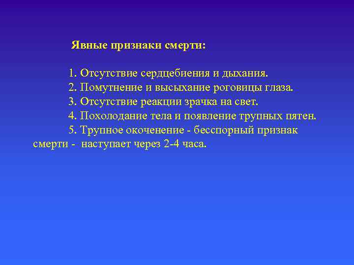 Явные признаки смерти: 1. Отсутствие сердцебиения и дыхания. 2. Помутнение и высыхание роговицы глаза. 3. Отсутствие реакции зрачка на свет. 4. Похолодание тела и появление трупных пятен. 5. Трупное окоченение - бесспорный признак смерти - наступает через 2 -4 часа.