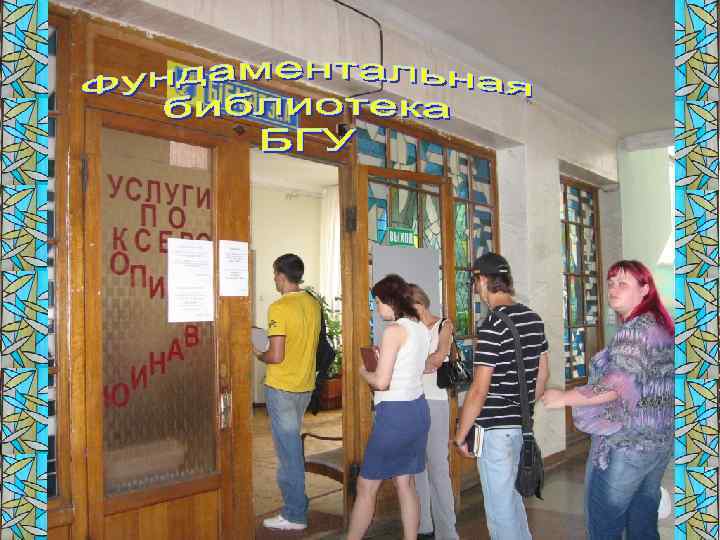 • Выписка из правил пользования библиотекой БГУ Права пользователей библиотеки • 2. 1. Студенты всех форм обучения имеют право бесплатно пользоваться основными видами библиотечно-информационных услуг, к которым относятся: • 2. 1. 1. Предоставление полной информации о составе библиотечного фонда через систему каталогов, картотек, баз данных и других форм библиотечного информирования на сайте ФБ БГУ http: //www. library. bsu. by. И м е ю т с я в