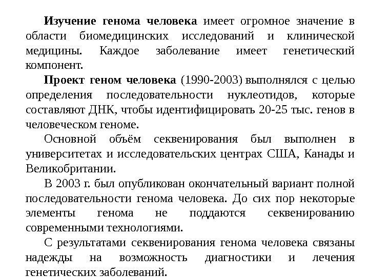 Изучение генома человека имеет огромное значение в области биомедицинских исследований и клинической медицины. Каждое заболевание имеет генетический компонент. Проект геном человека (1990 -2003) выполнялся с целью определения последовательности нуклеотидов, которые составляют ДНК, чтобы идентифицировать 20 -25 тыс. генов в человеческом геноме. Основной объём секвенирования был выполнен в университетах и исследовательских центрах США, Канады и Великобритании. В 2003 г. был опубликован окончательный вариант полной последовательности генома человека. До сих пор некоторые элементы генома не поддаются секвенированию современными технологиями. С результатами секвенирования генома человека связаны надежды на возможность диагностики и лечения генетических заболеваний.