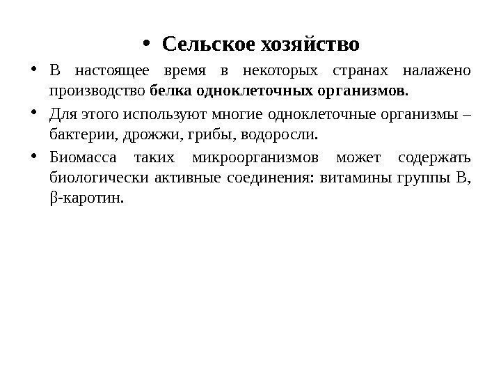 • Сельское хозяйство • В настоящее время в некоторых странах налажено производство белка одноклеточных организмов. • Для этого используют многие одноклеточные организмы – бактерии, дрожжи, грибы, водоросли. • Биомасса таких микроорганизмов может содержать биологически активные соединения: витамины группы В, β-каротин.