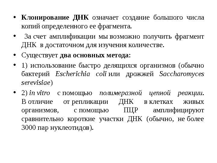 • Клонирование ДНК означает создание большого числа копий определенного ее фрагмента. • За счет амплификации мы возможно получить фрагмент ДНК в достаточном для изучения количестве. • Существует два основных метода : • 1) использование быстро делящихся организмов (обычно бактерий Escherichia coli или дрожжей Saccharomyces serevisiae ) • 2) in vitro с помощью полимеразной цепной реакции. В отличие от репликации ДНК в клетках живых организмов, с помощью ПЦР амплифицируют сравнительно короткие участки ДНК (обычно, не более 3000 пар нуклеотидов).