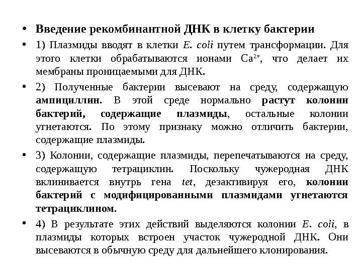 • Введение рекомбинантной ДНК в клетку бактерии • 1) Плазмиды вводят в клетки E. coli путем трансформации. Для этого клетки обрабатываются ионами Ca 2+ , что делает их мембраны проницаемыми для ДНК. • 2) Полученные бактерии высевают на среду, содержащую ампициллин. В этой среде нормально растут колонии бактерий, содержащие плазмиды , остальные колонии угнетаются. По этому признаку можно отличить бактерии, содержащие плазмиды. • 3) Колонии, содержащие плазмиды, перепечатываются на среду, содержащую тетрациклин. Поскольку чужеродная ДНК вклинивается внутрь гена tet , дезактивируя его, колонии бактерий с модифицированными плазмидами угнетаются тетрациклином. • 4) В результате этих действий выделяются колонии E. coli , в плазмиды которых встроен участок чужеродной ДНК. Они высеваются в обычную среду для дальнейшего клонирования.