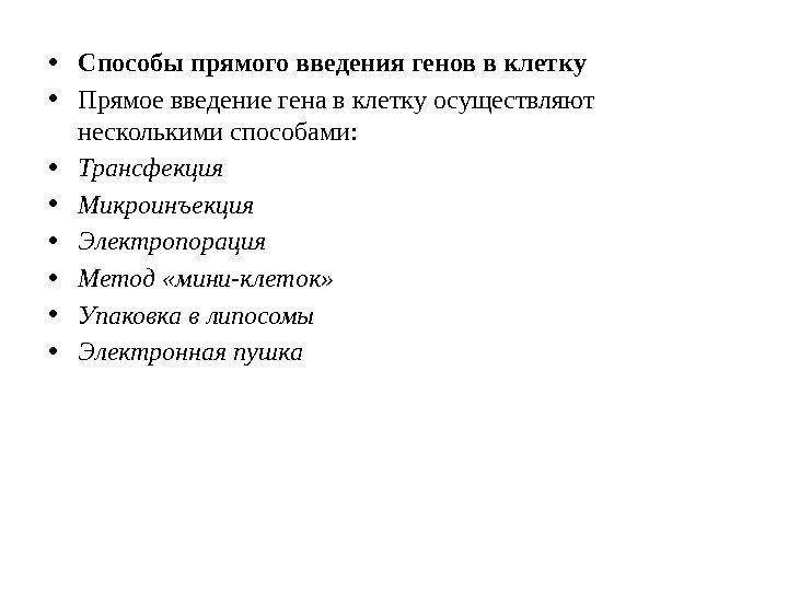 • Способы прямого введения генов в клетку • Прямое введение гена в клетку осуществляют несколькими способами: • Трансфекция • Микроинъекция • Электропорация • Метод «мини-клеток» • Упаковка в липосомы • Электронная пушка