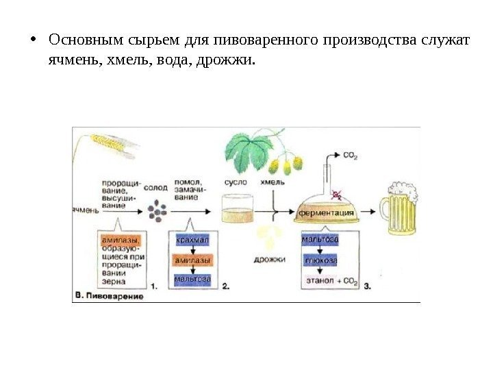 • Основным сырьем для пивоваренного производства служат ячмень, хмель, вода, дрожжи.