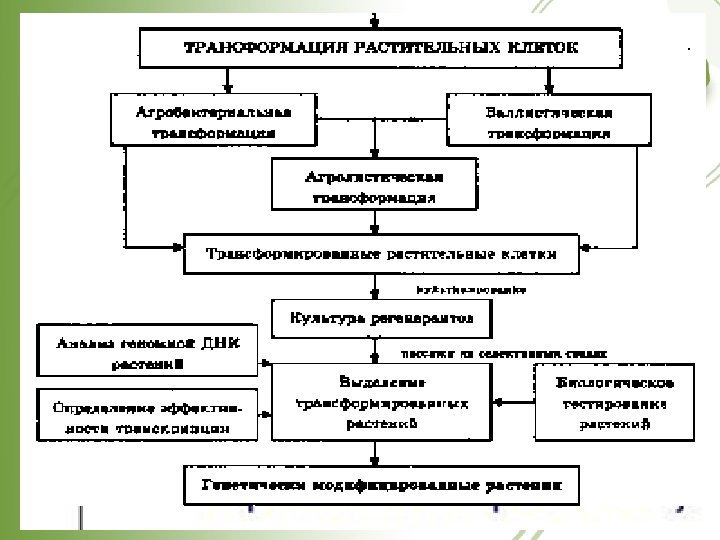 Этапы получения трансгенных растений (до принятия решения об интродукции) Создание и амплификация r. ДНК Выбор и подготовка клеток реципиентов для трансформации Встраивание трансгена в геном клетки реципиента Отбор трансформированных клеток Стимуляция регенерации побегов или эмбриогенеза из трансформированных клеток (in vitro) Адаптация пробирочных трансгенных растений к условиям теплицы Полевые испытания на биобезопасность