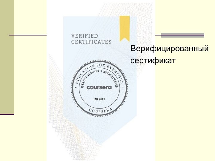 Новое! Право на Signature Track (14 курсов) ST (Отслеживание подписи, точнее отслеживание почерка) новая опция, которая даст студентам возможность заработать проверенный (верифицируемый) сертификат. ST надежно связывает ваш курс с вашей личностью, позволяет уверенно показать миру, что вы достигли на Coursera. STпредлагает: n Использование удостоверения личности с фотографией и уникальный образец печати. n Заработать Верифицируемый сертификат (электронный сертификат с проверкой). n Поделиться своими электронными записями с работодателями, учебными заведениями, или кем-либо еще через уникальную, безопасную URL.