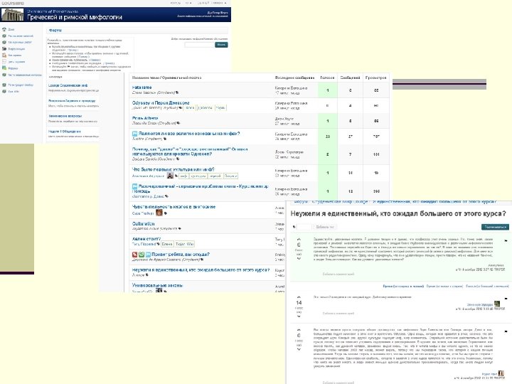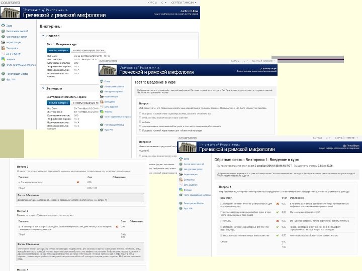Технологии n Курсы охватывают гуманитарные специальности (социология, психология, история, литература, экономика и другие), естественные науки (химия, математика, физика, генетика, медицина и другие), IT-сферу и пр. Удобство образовательной площадки в том, что единовременная регистрация открывает доступ ко всем представленным курсам без дополнительных усилий. Кроме того предложения различных вузов собраны в одном месте и удобно структурированы. n Как уже указывалось, кардинальным отличием от существовавших и существующих онлайн-курсов и открытых образовательных ресурсов прежнего поколения является то, что это настоящее университетское обучение. Оно начинается в определённый день и имеет определенное завершение. Студенты еженедельно смотрят видео и делают домашние задания, которые надо сдать в срок, за которые получают оценки. Дафна Колер в качестве доказательства «настоящего» учебного процесса приводит график использования ресурсов и посещаемости, который имеет характерную корреляцию со сроками выполнения и сдачи заданий. «Эти скачки показывают, что все студенты тянут до последнего»