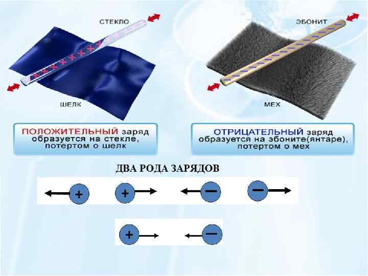 • Разноимённые заряды притягиваются, одноимённые отталкиваются. • Заряд можно обнаружить по действию на другое тело или с помощью приборов: Пример: с помощью электроскопа и электрометра (обнаруживает и измеряет).