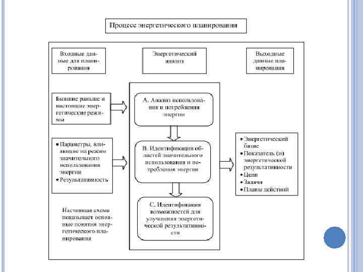 Энергетическое планирование Организация должна идентифицировать, внедрить и иметь доступ к применимым к ее деятельности законодательным и другим требованиям, которые она обязалась выполнять в отношении использования, потребления энергии и ЭЭ. Организация должна определить, каким образом эти требования применимы к ее режиму использования, потребления энергии и ЭЭ, и обеспечить учет этих законодательных и других требований, которые организация обязалась выполнять при разработке, внедрении и поддержании функционирования системы энергетического менеджмента. Законодательные и другие обязательные для организации требования должны анализироваться через определенные интервалы времени.