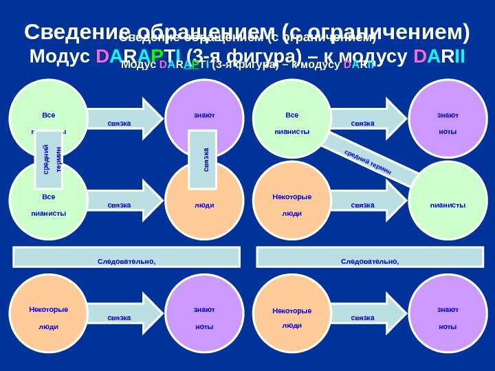связка средний термин связка связка. Сведение обращением (с ограничением) Модус D A R A P T I (3 -я фигура) – к модусу D A R II Все пианисты знают ноты Все пианисты люди Следовательно, Некоторые люди знают ноты Все пианисты знают ноты Некоторые люди пианисты Некоторые люди знают нотысредний термин связка. Обращение с ограничением Следовательно, Сведение обращением (с ограничением) Модус D A R A P T I (3 -я фигура) – к модусу D A R II
