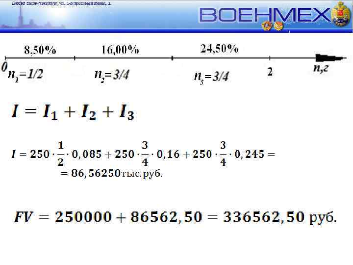 Некоторый коммерческий банк предлагает своим клиентам кредиты по простой переменной ставке: первоначальная ставка равна ставке рефинансирования РФ, через полгода ставка увеличивается на 7, 5%, еще через 3 квартала ставка увеличивается еще на 8, 5%. Какой будет сумма к погашению, если величина кредита 250. 000 руб. и кредит взят 20 марта 2010 г. на 2 года? Дано: Решение tнач: 20. 03. 10 PV= 250 тыс. руб. База = 8, 50% n 1= 1/2 г, r 1 = 8, 50% n 2= 3/4 г, r 2 = 16, 00% n 3= 3/4 г, r 3 =24, 50% Найти: FV 8, 5% 0 16, 0% 1/2 24, 5% 5/4 2 n, г 1. Так как проценты начислялись простые, то каждый временной период проценты будут начисляться на одну и туже величину – величину вложенного капитала – 250 000 руб. 2. Два года кредитной операции разбили на интервалы постоянства ставки. 3. Определим начисленные проценты за 2 года.