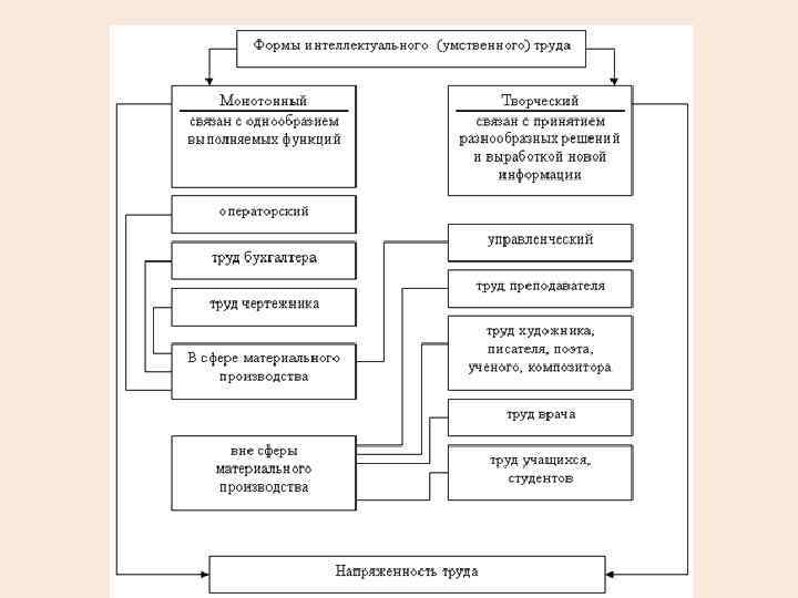n Напряженный умственный труд вызывает отклонения от нормы тонуса гладких мышц внутренних органов, кровеносных сосудов, в особенности сосудов мозга и сердца. n Умственная работа тесно связана с работой органов чувств, в первую очередь зрения и слуха. Известно, что умственная работа более плодотворно протекает в условиях тишины. n Установлено, что легкая мышечная работа стимулирует умственную деятельность, а тяжелая, изнурительная работа, наоборот, понижает ее, снижает качество.