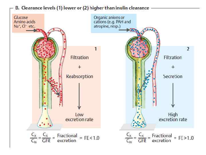 Порог выведения – концентрация вещества в крови, при которой оно не может быть полностью реабсорбировано и появляется в конечной моче. Пороговые вещества - имеющие порог выведения (глюкоза > 10 ммоль/л в крови). Непороговые вещества - выделяются с мочой при любой их концентрации в крови (инулин).